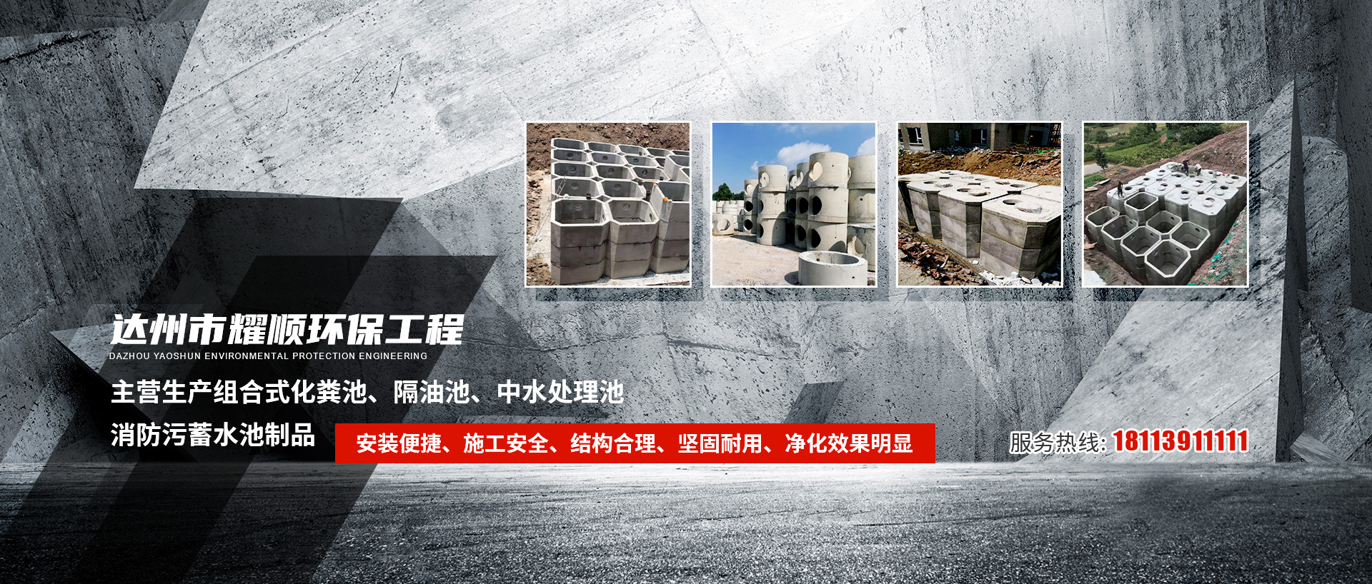 達州市耀順環保工程有限公司位于四川東北部、達州市中部通川區。本公司采用全自動模壓生產線,擁有專業的生產技術和設備,同時擁有一支專業的施工隊伍。本公司堅持質量第一、互惠發展,讓您的居住環境更美、更舒適,是我們工人的宗旨。本公司愿與廣大建筑同仁一道,為美化城市作出貢獻。我公司現生產組合式化糞池、隔油池、中水處理池、消防污蓄水池制品。我們的產品在建筑工程中不斷接受檢驗,具有安裝便捷、施工安全、用時短、結構合理、堅固耐用、抗滲性能好、凈化效果明顯、經濟合理的優特點。...